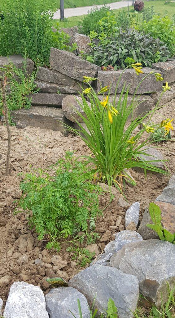 Hier in der Kräuterspirale hat nun die Sorte ‚Stella d’Oro‘ ihren Platz gefunden. Eine kleinblütige Hybride mit langer Blütezeit.